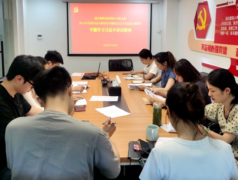 為深入學(xué)習貫徹習近平新時(shí)代中國特色社會(huì )主義思想主題教育,認真落實(shí)浙茶集團黨委的工作部署和學(xué)習要求,7月28日,浙茶集團獅峰茶業(yè)黨支部專(zhuān)題學(xué)習習近平總書(shū)記在廣東、河北、陜西、江蘇考察時(shí)的重要講話(huà)、重要指示精神。
