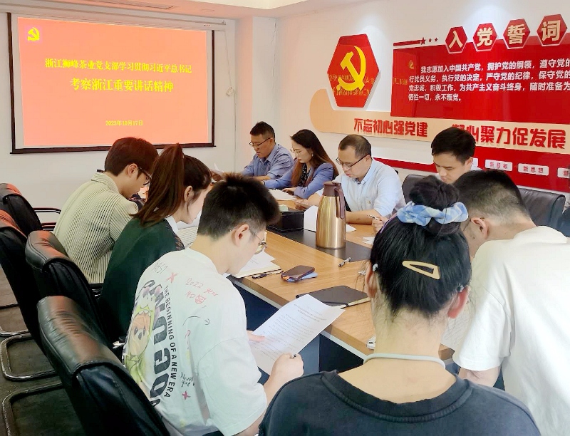 根據浙茶集團黨委部署安排,10月17日,浙茶集團獅峰茶業(yè)黨支部認真開(kāi)展專(zhuān)題學(xué)習會(huì ),深入學(xué)習習近平總書(shū)記考察浙江重要講話(huà)精神。支部書(shū)記陸耿林主持會(huì )議并講話(huà),支部黨員、入黨積極分子參會(huì )。